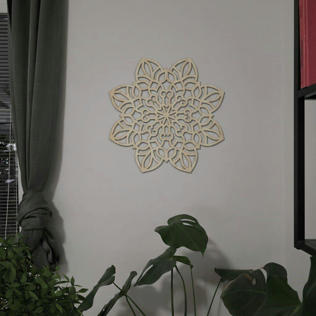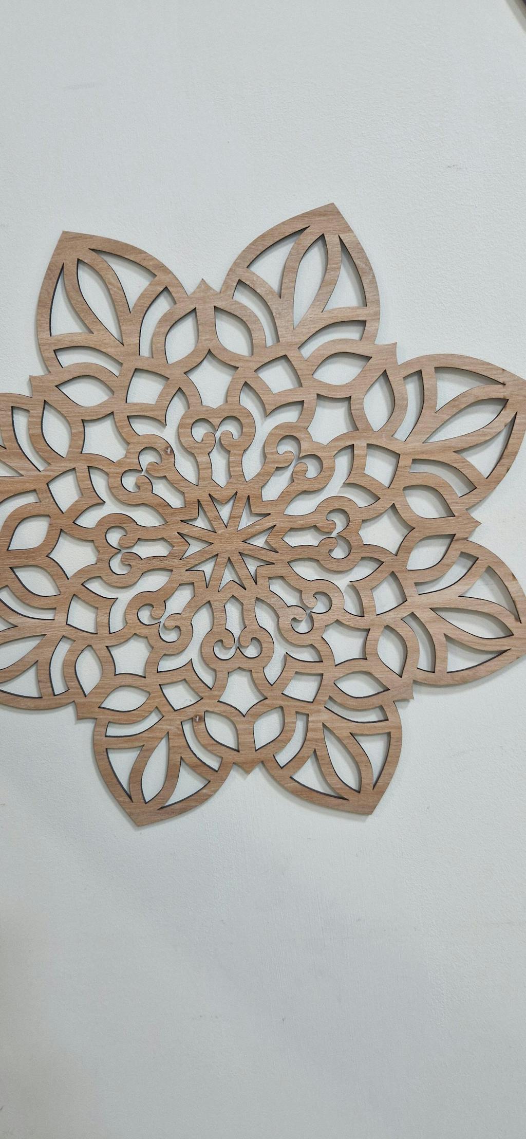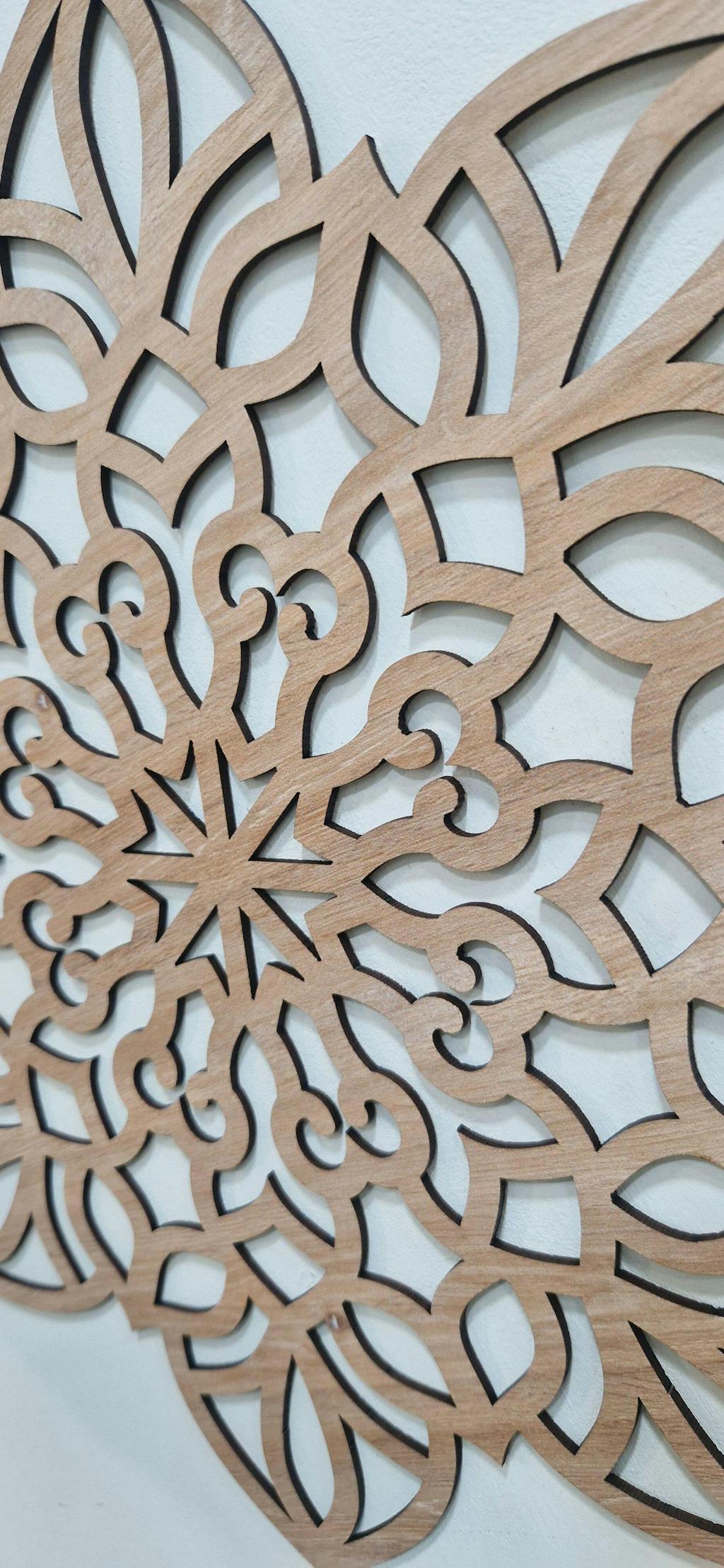 Táto nádherná drevená mandala je majstrovským dielom precíznosti a geometrickej krásy. Inšpirovaná orientálnymi vzormi a kvetinovými motívmi, vytvára fascinujúci vizuálny zážitok. Jej stred sa lúčovito rozrastá do bohatých, prepletených okvetných lístkov, ktoré symbolizujú rozkvet a nekonečnú energiu. Je to ideálna dekorácia pre tých, ktorí chcú do interiéru vniesť prvok spirituality, rovnováhy a elegancie.