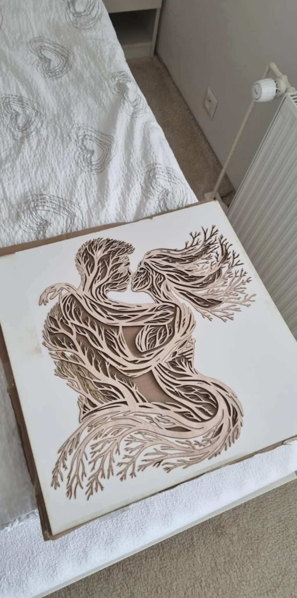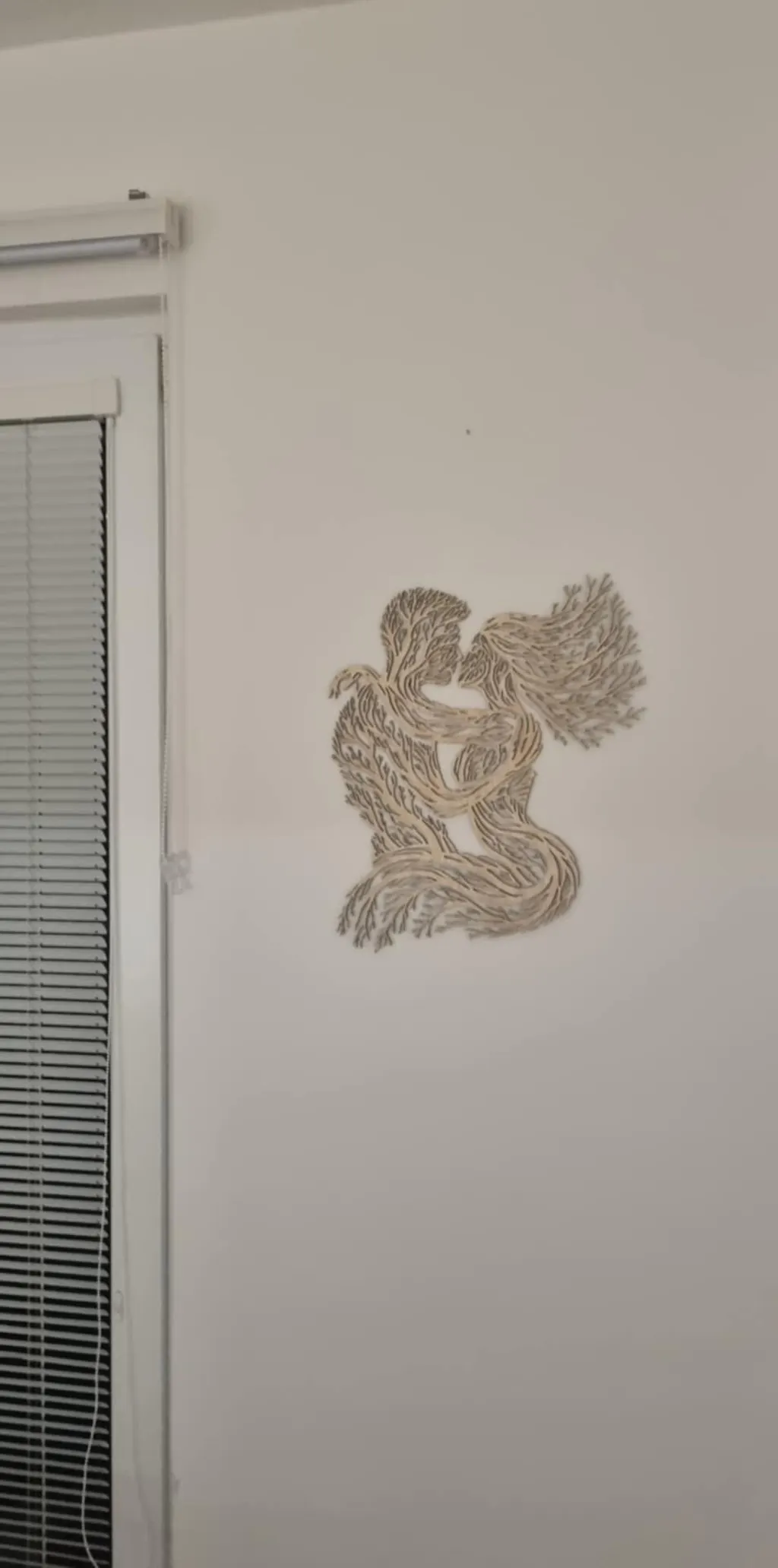 Tento umelecký kúsok nie je len obyčajným obrazom, ale emotívnym príbehom o dvoch bytostiach, ktoré sa stávajú jedným. Dizajn pripomínajúci korene a vetvy stromu formuje siluetu zamilovaného páru v objatí, čím dokonale prepája motív ľudskej lásky so silou prírody. Je to dekorácia, ktorá okamžite vnesie do spálne či obývačky vášeň, nehu a umeleckú hĺbku.