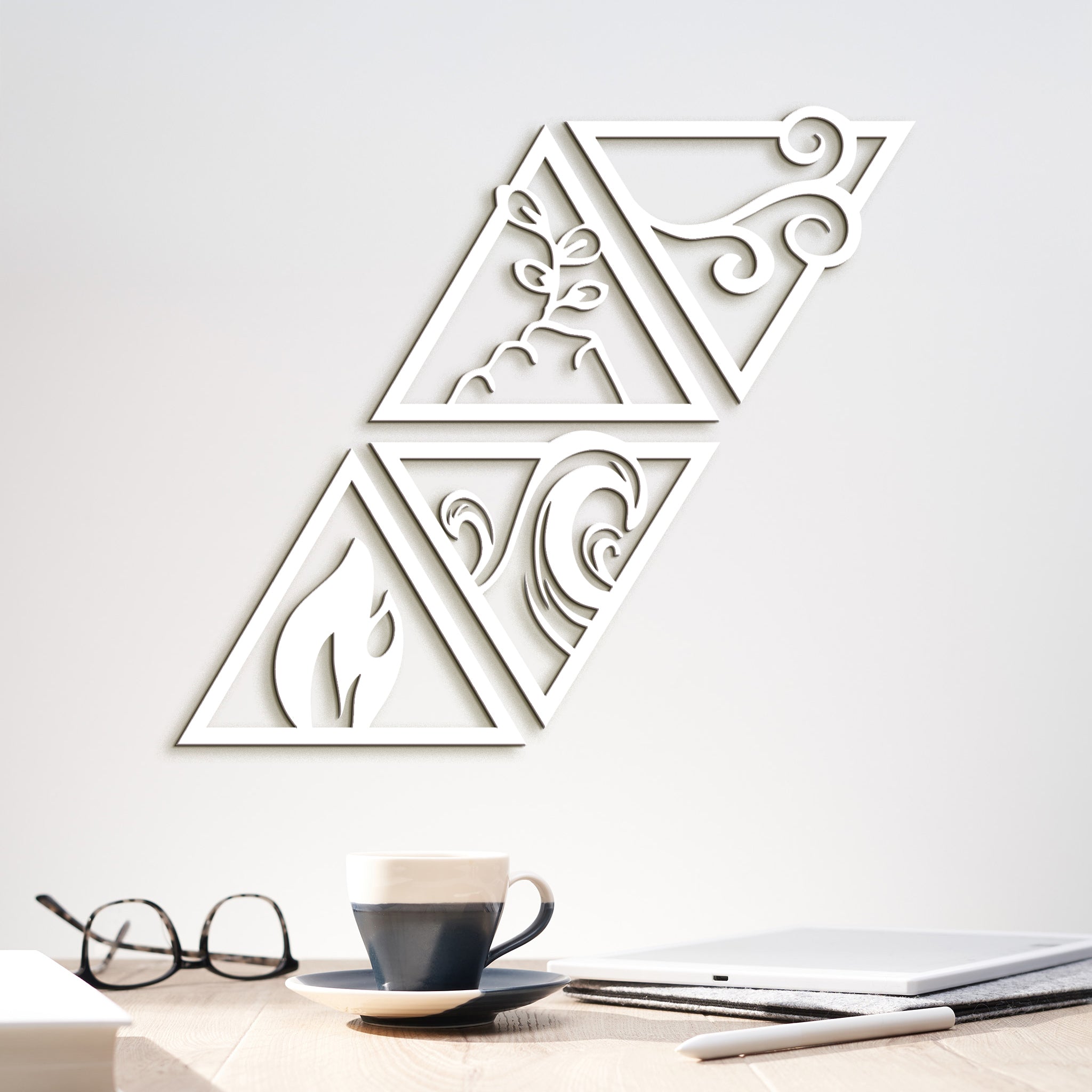 Minimalistický trojuholníkový obraz predstavujúci symboly štyroch živlov - ohňa, vody, vzduchu a zeme. Tento viacdielny drevený obraz v chill štýle prináša do vášho domova harmóniu a rovnováhu prírodných síl. Jemné línie a symbolické tvary vytvárajú pokojnú atmosféru ideálnu pre relaxáciu a meditáciu.